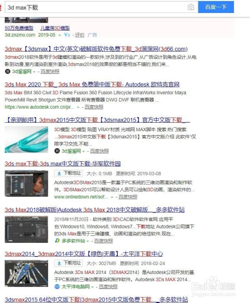 打开百度,搜刮3D max。正常环境下,下面图片中的网站都是能正常下载的。可是下载套路比力的多,很轻易下载到本身不需要的内容,我就给大师分享一下我的经验。