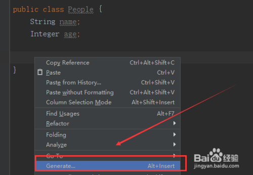 在类中代码处,右键单击选择Generate