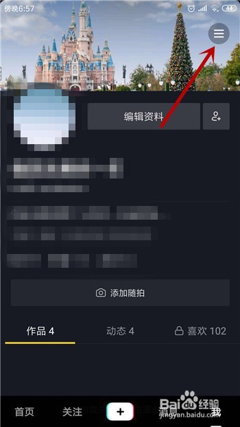 这样在抖音的小我本家儿页里点击右上角的【三】按钮,如图所示。