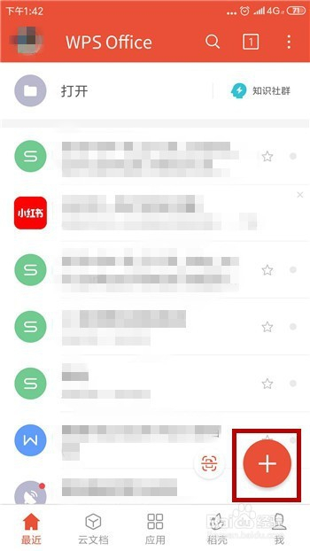 打开我们手机中的WPS Office,在首页里点击右下角的【+】按钮。