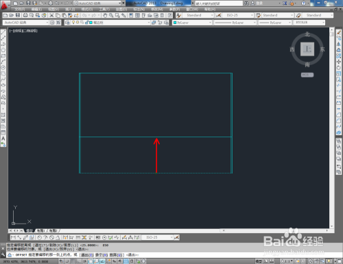 点击右边东西栏中的【偏移东西】,在号令栏输入偏移数值:25后,按图示对侧边进行标的目的内偏移。同样的步调,对别的一条侧边的标的目的内偏移操作后,按图示继续对横边进行偏移操作。完当作后,点击右边东西栏中的【修剪】,按图示对线段端部进行修剪(如图所示);