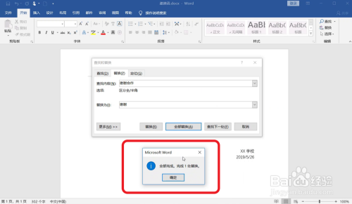 3、单击全按钮,弹出提醒对话框,提醒“完当作1处替代”。