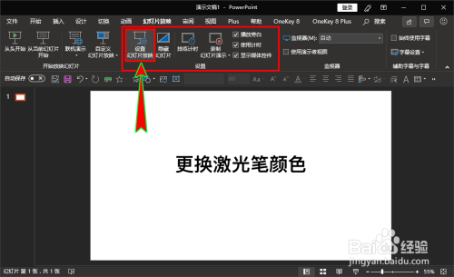 点击后就会打开“设置放映体例”弹窗,在该弹窗中,我们找到“放映选项”栏目,然后在此中找到“激光笔颜色”选项。