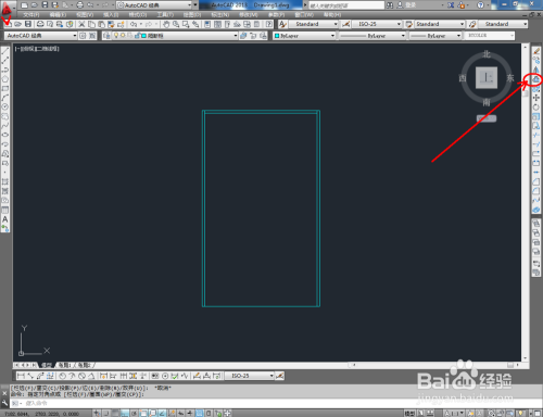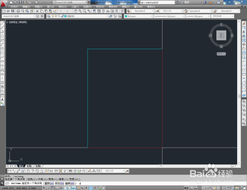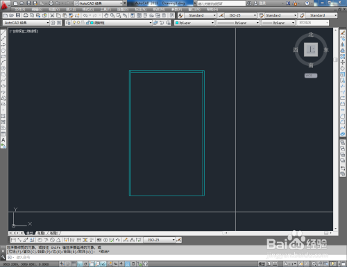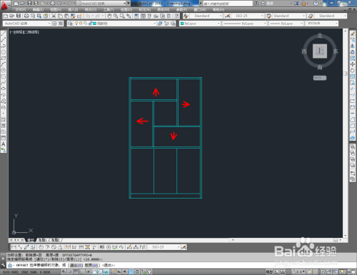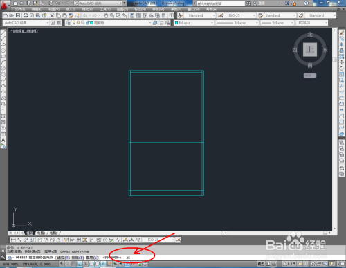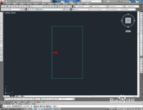 点击右边东西栏中的【偏移东西】,在号令栏输入偏移数值:25后,按图示对侧边进行标的目的内偏移。同样的步调,对别的一条侧边和顶边的标的目的内偏移操作后,点击右边东西栏中的【修剪】,按图示对线段端部进行修剪(如图所示);