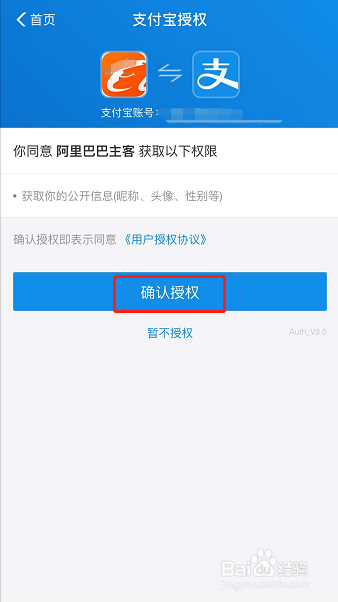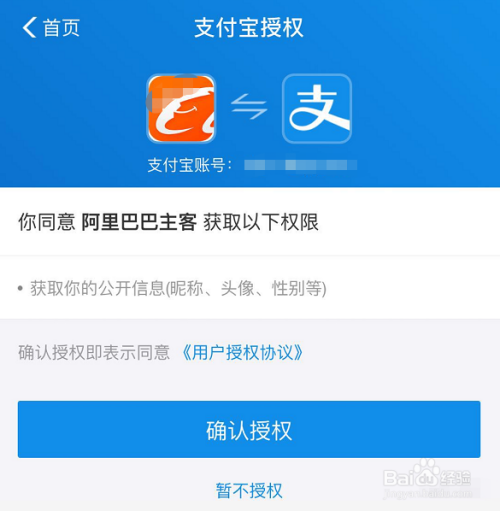 点击后页面会主动跳转到支付宝授权页面,如图所示,点击蓝色简直认授权两账号即可绑定!