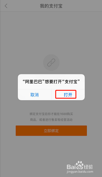 然后屏幕上会跳出阿里巴巴想要打开支付宝的对话框,点击对话框中的打开!