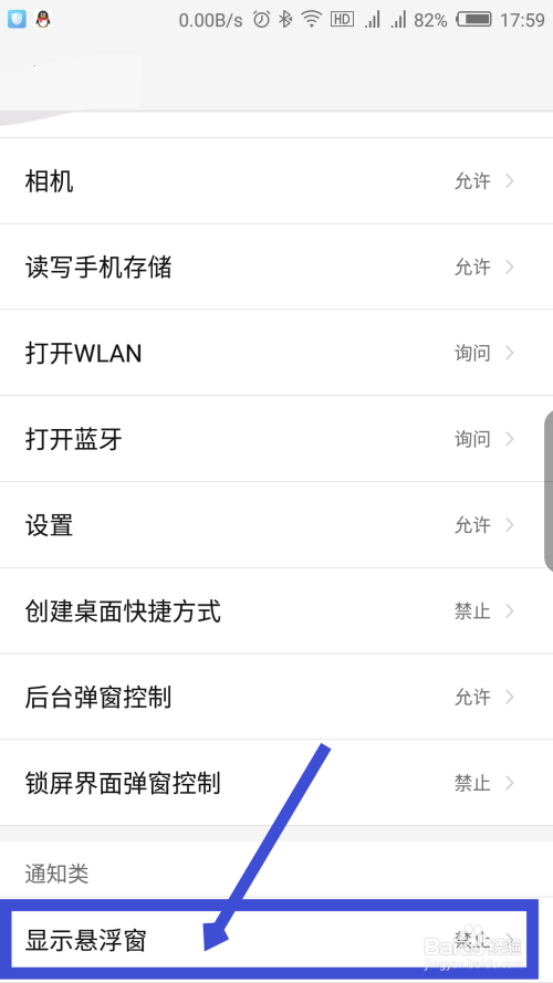 打开单项权限设置界面,就看到显示悬浮窗设置,点击一下开启悬浮窗。如图所示