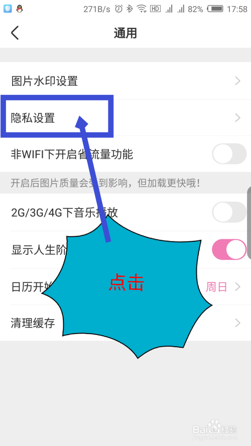 在打开的通用里面,点击第二个隐私设置功能选项。如图所示