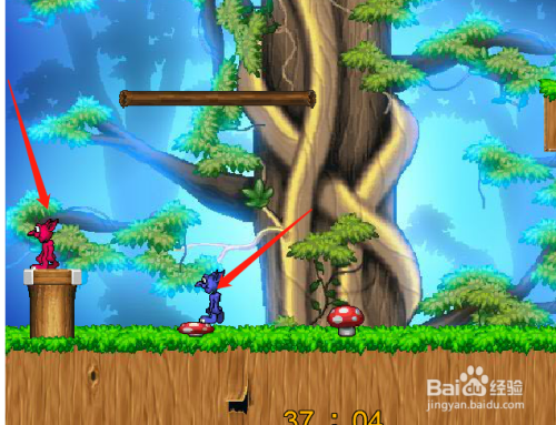 然后从起点起头,两只狐狸同时跳跃过第一个蘑菇,红色狐狸占到木桩上,蓝色狐狸跳跃在蘑菇上,木桩升起,如下图