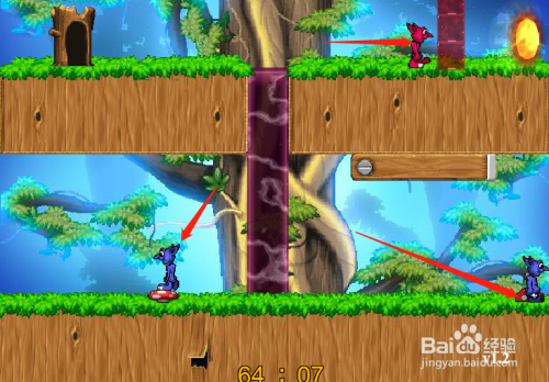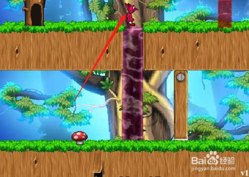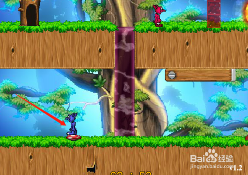 接下来从起点起头,两只蓝色狐狸从紫色水柱失落下去,一向跳跃到蘑菇上,一只走到下面蘑菇面前,如下图