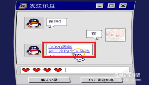 进入到小我轨迹的界面后,我们首先映入眼帘的就是这个距今已经十分长远的聊天界面,是不是勾起了一大堆大叔们的回忆呢~从速点击蓝色字体,来看一看我们和企鹅之间的故事吧!
