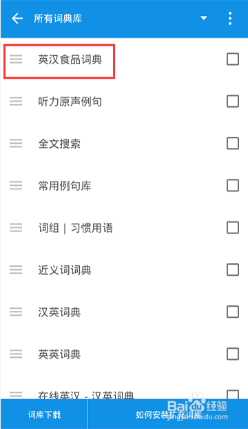 进入英语专业的词库下载页面,选摘要下载的词库,好比:英汉食物辞书。