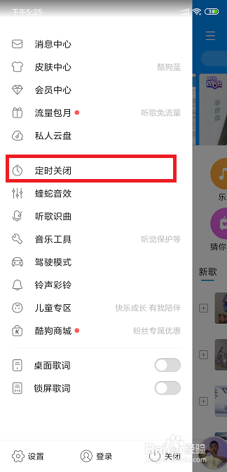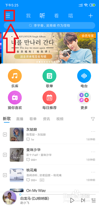 首先我们进入酷狗的本家儿界面,然后我们可以看到左上角的处所有设置选项,我们点击最左上角的设置。