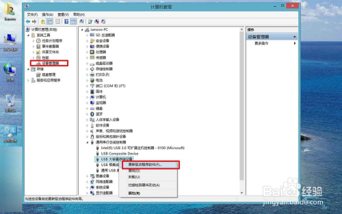 解除了硬件没有问题,接着点击“这台电脑”,右键选择“办理”中点击“设备办理”,找到“USB大容量存储设备”有没有呈现无法识别感慨号,可以点击“更新驱动程序软件”,看可以或许让U盘呈现吗