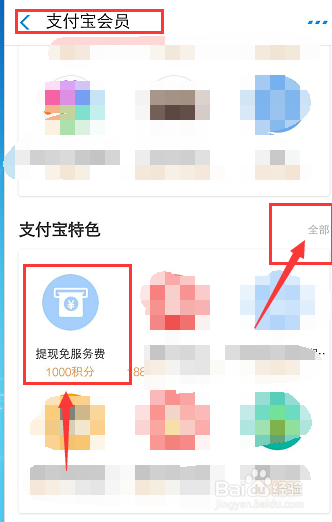 在支付宝会员页面中,页面往下拖动,找到支付宝特色,点击全数: