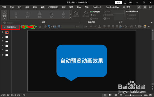 勾选上之后,当我们再为所选对象设置了动画结果,或者更改了所选对象的动画结果后,ppt就会主动为我们预览设置后的动画结果。