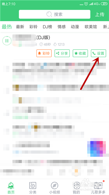 点击之后会在歌曲的下方呈现四个选项,点击此中的【设置】。