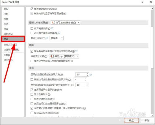 呈现【Powerpoint 选项】对话框,点击左侧号令栏的【高级】。