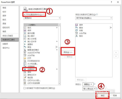 点击【其他号令】,弹出【Powerpoint选项】对话框,在里面点击你需要添加的号令,点击【添加】,再点击【确定】,回头看看添上了吗?