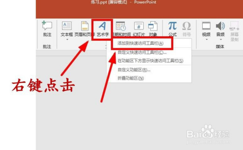 一些功能区的按钮也可以添加到快速拜候东西栏,右键点击你想添加的按钮,在弹出的选项中选择【添加到快速拜候东西栏】。好比我想把“艺术字”添加到快速拜候东西栏。就右键点击“艺术字”,选择【添加到快速拜候东西栏】就OK了。