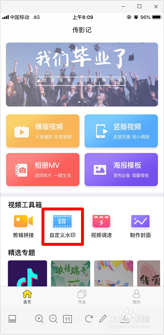 打开传影记,点击“自界说水印”,如图。