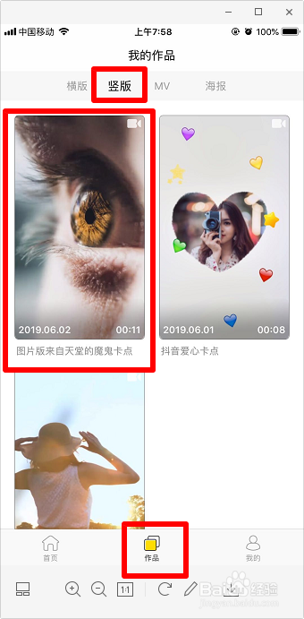 会主动进入“作品”,因为我们建造的是竖屏,所以点击“竖版”,点击进入 做好的视频。点击“去水印”,然后再“下载”,最后颤栗音即可。