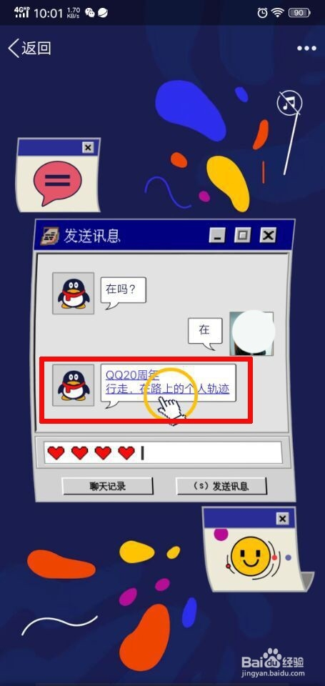 5、点击手机屏幕中弹出的对话内容qq20周年小我轨迹。