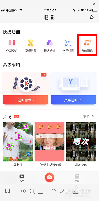 安装并打开快影,点击“音效配乐”。