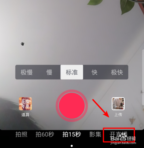 点击进入抖音拍摄界面,可以看到下方有一个开直播的选项,若是没有申明没有直播权限,点击该选项。