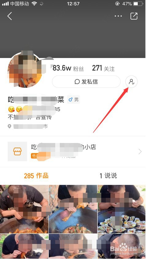 然后就会进入该用户的本家儿页,点击如图所示的按钮,就可以打消存眷了,如图所示。