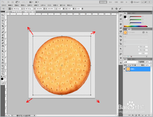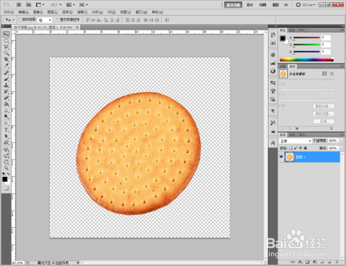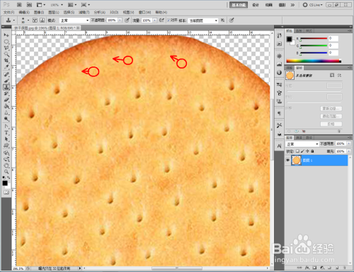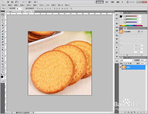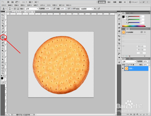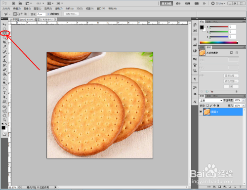 打开Photoshop CS5软件,将我们找好的饼干原图片拉进ps作图区域。双击布景图层,将布景图层转换为通俗图层后,点击【多边形套索东西】框选出我们需要的部门后,同时按下【Ctrl】+【J】进行图层复制并删除原图层(如图所示);