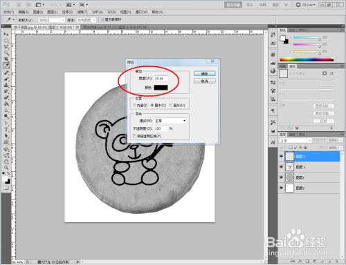 点击【新建图层】图标,新建一个图层后,点击【椭圆选框东西】绘制一个圆形选框。点击【编纂】-【描边】,按图示设置好描边的各个参数绘制出一个圆框图案(如图所示);