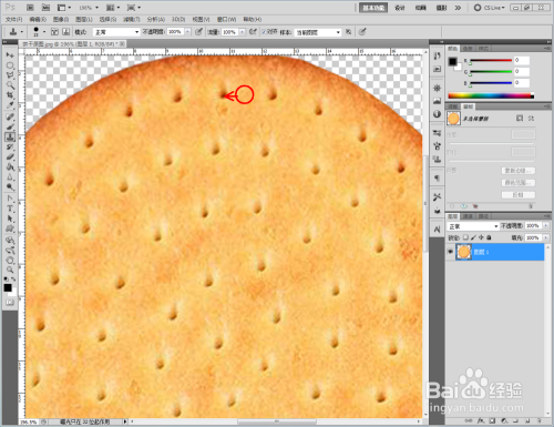 同时按住【Ctrl】+【T】,对饼干图案进行调整后,点击【仿制钤记东西】,按住【Alt】键拾取平面部门对饼干上的点进行填补。填补完当作后,点击【新建图层】新建一个图层并填充为白色布景,完当作饼干彩色贴图的建造(如图所示);