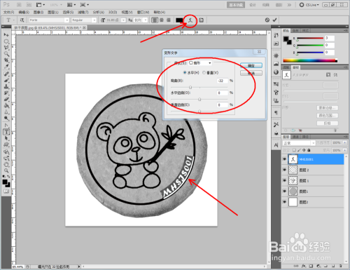 点击【文字东西】,输入文本内容:MHSJS001并进行文字变形。完当作后,将文字进行扭转复制。调整好各图层的位置关系后,将图片存储为jpg格局,这样我们的饼干贴图便全数建造完当作了。