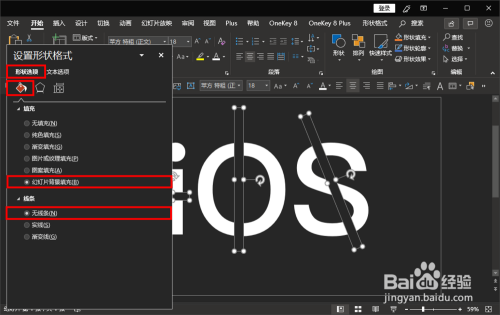 在打开的“设置外形格局”弹窗中,我们选择“外形选项”菜单,然后鄙人面继续选择“填充与线条”菜单,最后将填充设置为“幻灯片布景填充”,将线条设置为“无线条”即可。
