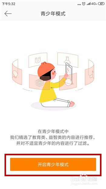 然后会为我们介绍什么是青少年模式,确认开启点击【开启青少年模式】。