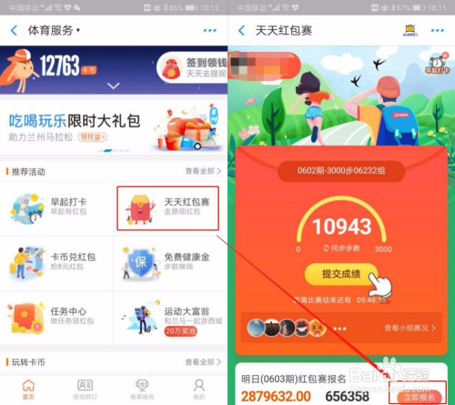 在“体育办事”页面点击【天天红包赛】,在打开的页面中点击【当即报名】按钮。这里也需要支付必然的报名包管金,金额可本身选择。支付体例同样可以选择支付宝或阿里体育办事账户金额,最后点击【当即支付】按钮,然后提醒报名当作功。