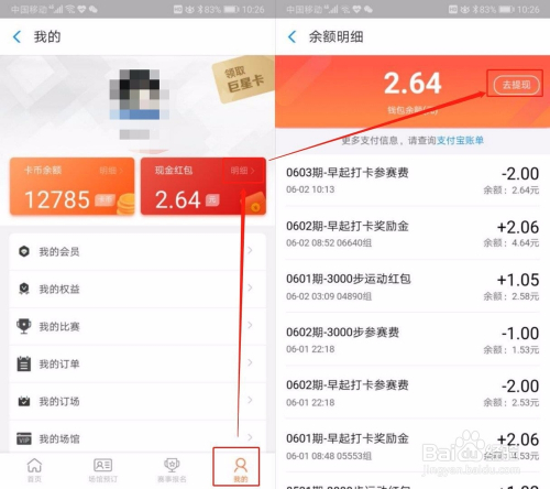 阿里体育获得的红包奖励会存放在阿里体育钱包里面,需要手动提现。点击“我的”,再点击“现金红包”里面的【明细】按钮,打开“余额明细”页面。然后点击【去提现】按钮,就能将红包提现到支付宝。