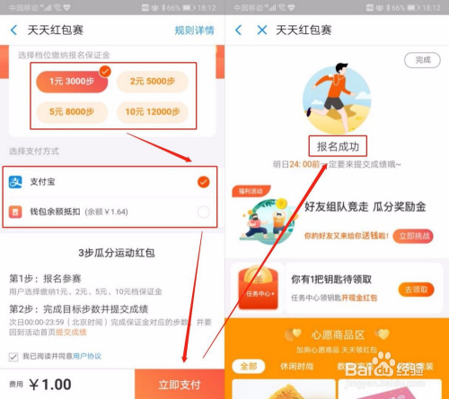 “天天红包赛”活动也是前一天报名,第二天完当作。并且还可以按照本身完当作的步数选择分歧的档位,矫捷性较大。报名当作功后需要在第二天24:00前提交步数,24:00后起头计较。同样,若是没有完当作指定的步数,那么包管金也就没有了,是以这个活动还能让我们养当作活动的好习惯。