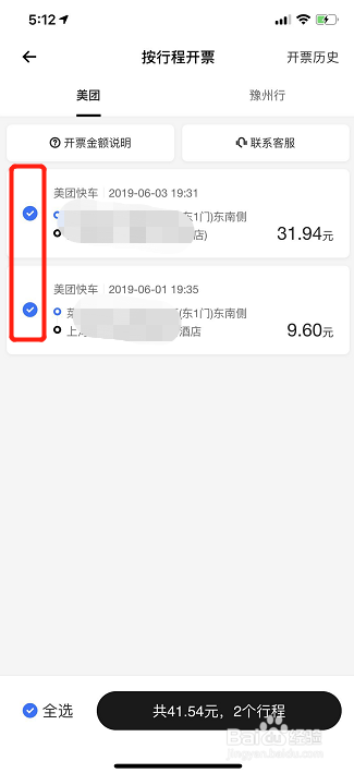 选择你要开票的打车记实,可以多选;