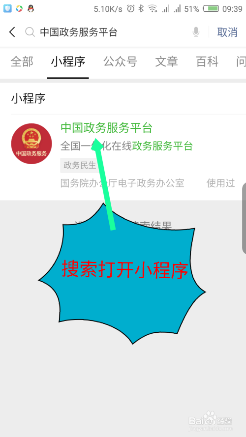 在微信里面,搜刮中国政务办事平台小程序,点击并打开。如图所示