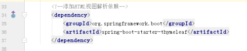 <!--添加HTML视图解析依靠--><dependency> <groupId>org.springframework.boot</groupId> <artifactId>spring-boot-starter-thymeleaf</artifactId></dependency>