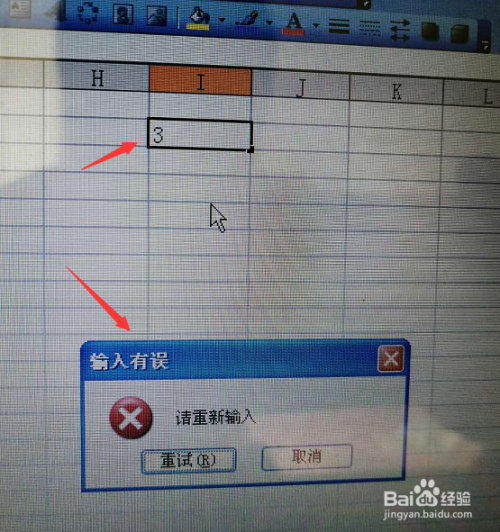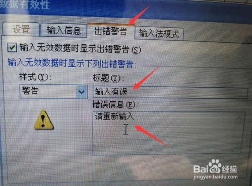 在犯错警告设置中,样式选择警告,再输入题目及错误信息提醒等,点击确定即可