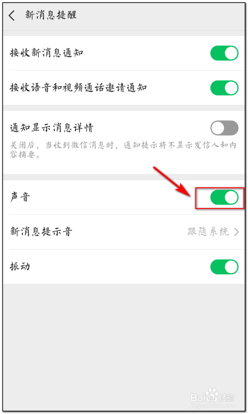 在新动静提醒界面,将声音项的按钮点击开启