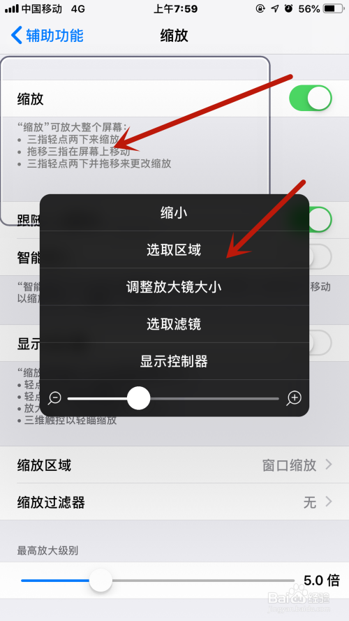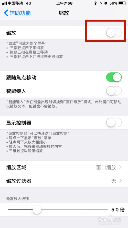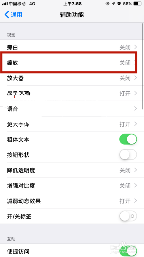 将缩放打开,然后三指轻点两下屏幕进行缩放