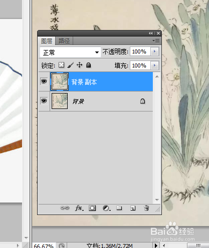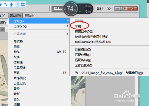 然后再在PS里面打开一张水仙国画的并复制图层布景,点击窗口---摆列--------,平铺,