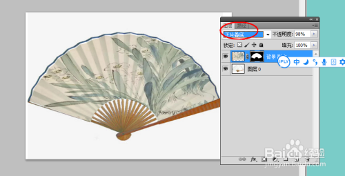 点击下面的蒙板东西,我们可以看到除了扇面部门有国画,其他部门的国画消逝了,可是这个时辰的国画是一个平整的面,与扇面还不是很贴合,选择设置为正片叠底,,这样图片就有了折扇上折痕升沉的感受,很是的传神