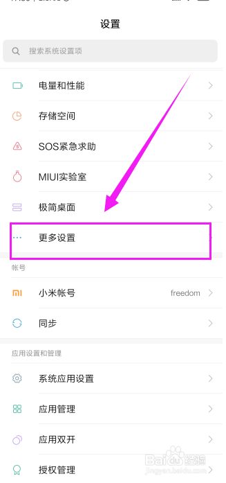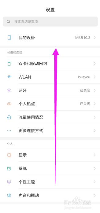 这时,就来到设置的页面,标的目的上滑脱手机屏幕,如图所示