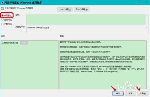 查看只运行指定的Windows应用程序运行状况,点窜为【未设置装备摆设】。