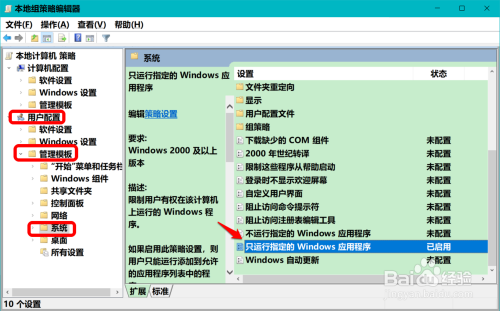 在当地组策略编纂器窗口中睁开【用户设置装备摆设】-【办理模板】-【系统】,在右侧找到并左键双击【只运行指定的Windows应用程序】;